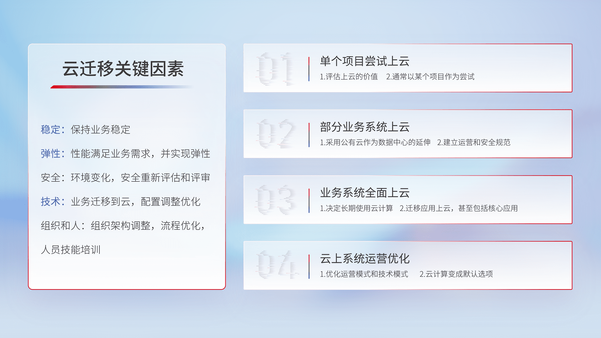 结合实际业务,,从规划设计、、云平台选型、、云原生改造、、数据迁移、、集成交付,,,,迁移全过程为客户识别最佳上云路径,,,,做好风险识别管理,,设计网络架构、、身份权限、、、安全审计合规、、操作审计、、、日志审计、、、、监控告警策略、、、、多站点容灾设计等,,对云上基础设施进行整体规划,,,,提升IT治理水平,,,,以满足弹性、、、高可用、、、高性能的需求。。。