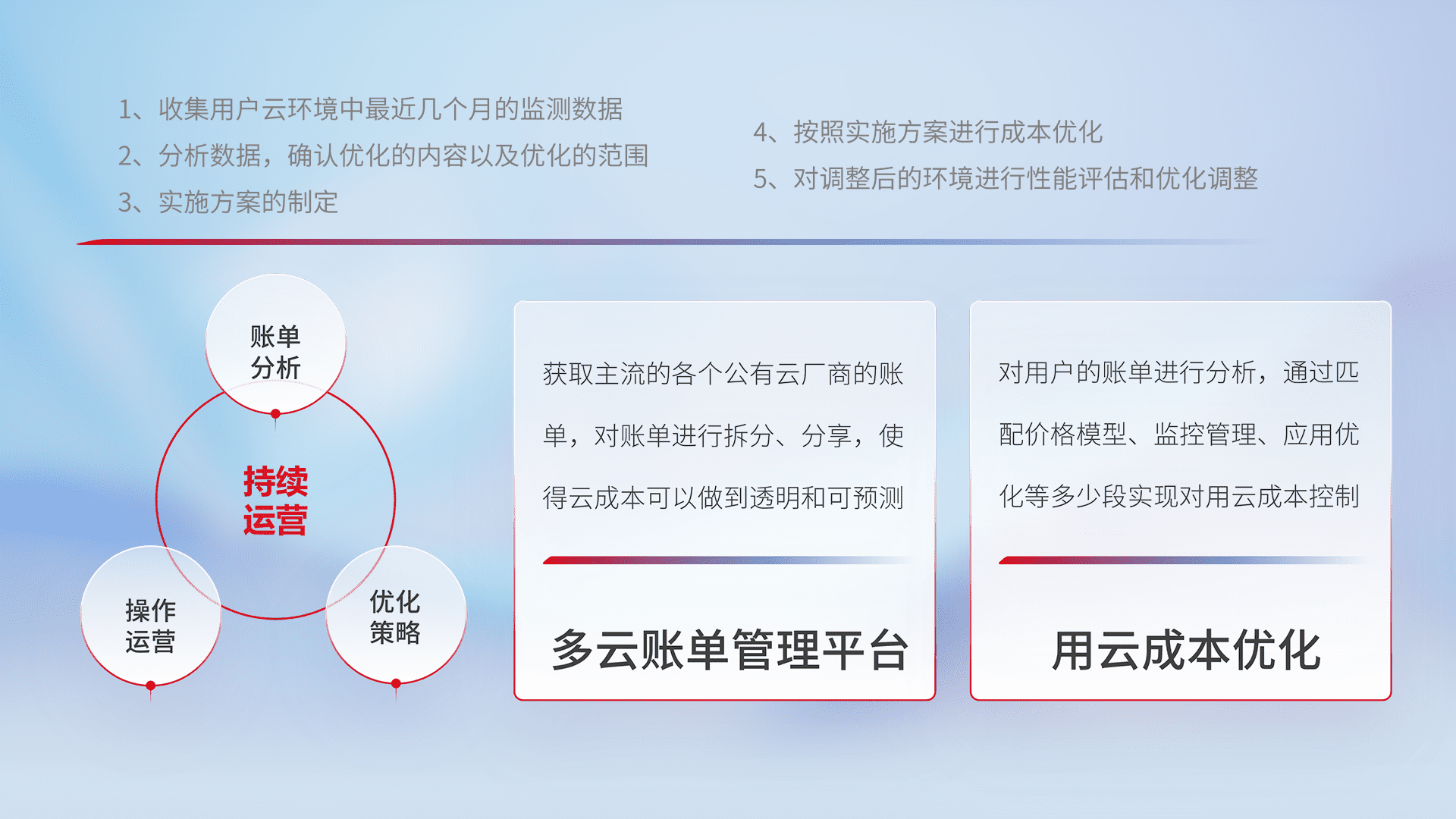 通过多云纳管,,,,以统一的资源数据模型把客户的云资源进行抽象和封装,,进而实现对多云资源的统一操作,,保障云资源管理的可靠性、、、稳定性与可用性。。。。量身定制化运维内容,,,,配置、、、、开发运维、、、补丁管理、、备份、、、、监控、、、、认证和访问管理、、、、审计和日常巡检等,,,,保障在用云过程中的可靠度,,,稳定度以及高可用率。。